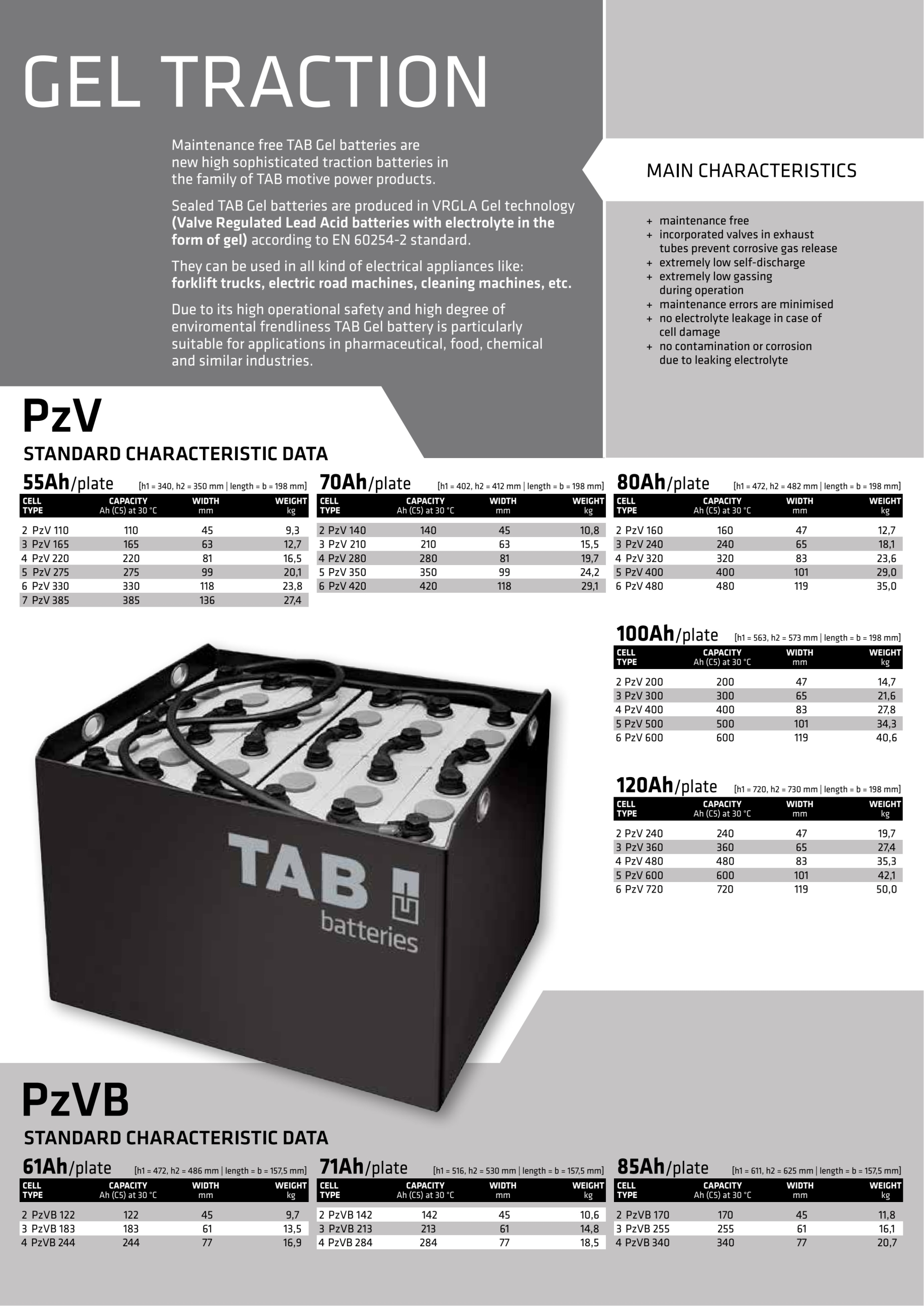 Ắc quy TAB Gel kín được sản xuất theo công nghệ VRGLA Gel (ắc quy axit chì điều chỉnh van với chất điện phân ở dạng gel) theo tiêu chuẩn EN 60254-2.